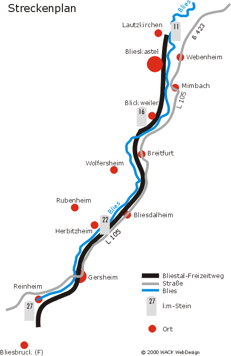 Die gesamte Strecke ist knapp 16 km lang, asphaltiert und enthält keine Steigungen. Sie ist somit anfängertauglich und für alle Fahrradtypen geeignet: vom dünnbereiften Rennrad bis hin zum Mountainbike. Start- und Endpunkte sind in jedem Ort entlang der Strecke (siehe Karte oben) von Lautzkirchen bis Reinheim möglich. Von der Umgebung her liegt die gesamte Strecke mit Ausnahme der Ortsdurchfahrten vollständig im Grünen entlang der Blies. Zahlreiche Streckenabschnitte bieten auch an heißen Sommertagen viel Schatten. | |||